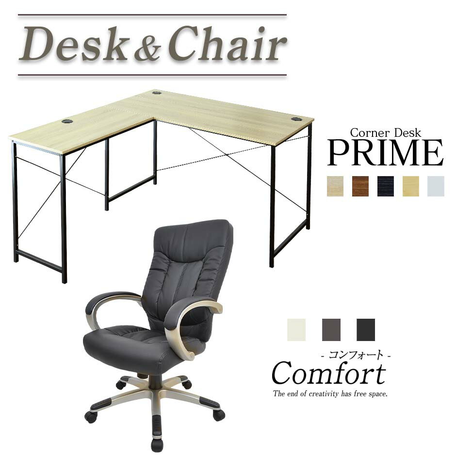 パソコンデスク オフィスチェア セット デスク チェア 在宅 テレワーク 木製 L字 コーナー 上下昇降 ロッキング 肘付き ハイバック プライム コンフォート