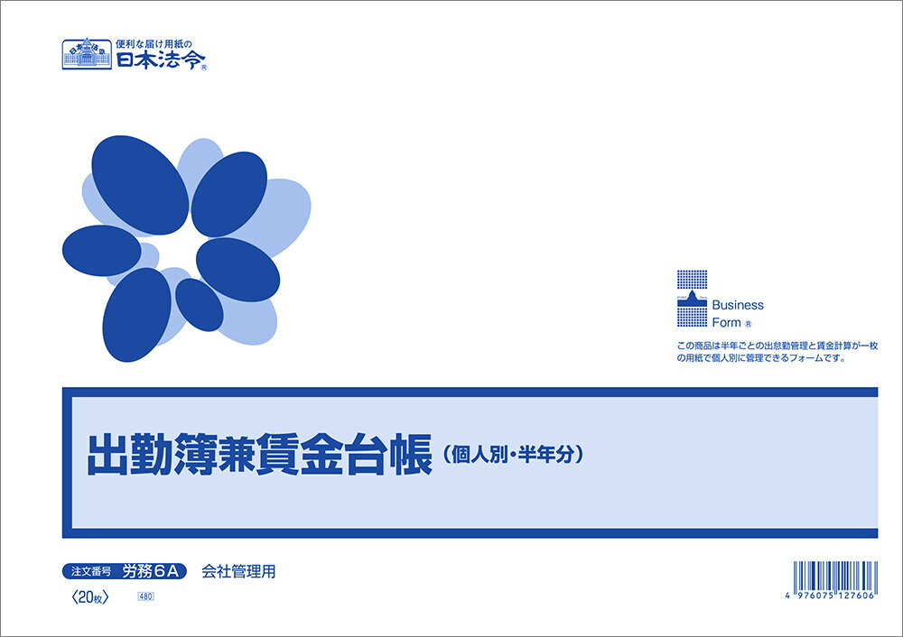(株)日本法令法令用紙:労務 6A出勤簿兼賃金台帳法令様式 出勤簿 賃金計算簿