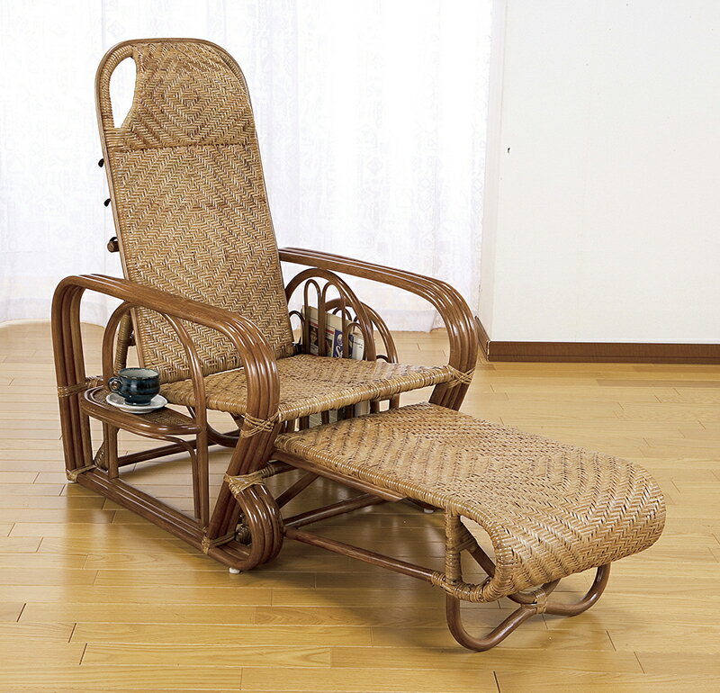 天然籐リクライニングチェア(マガジンラック・サイドテーブル付き) 完成品 収納 コンパクト ラタン 南国 レトロ 和モダン 和風 アジアンテイスト 通気性 フッ..