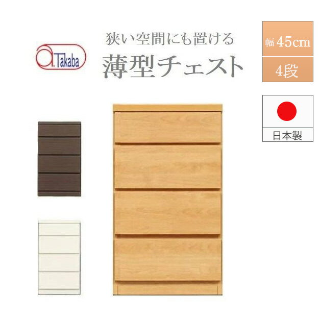 薄型チェスト 木製 頑丈 日本製 完成品 幅45 4段 奥行30 大川家具 タンス 衣類収納 チェスト スリム コンパクト 省スペース アルファタカバ リビング 寝室 玄..