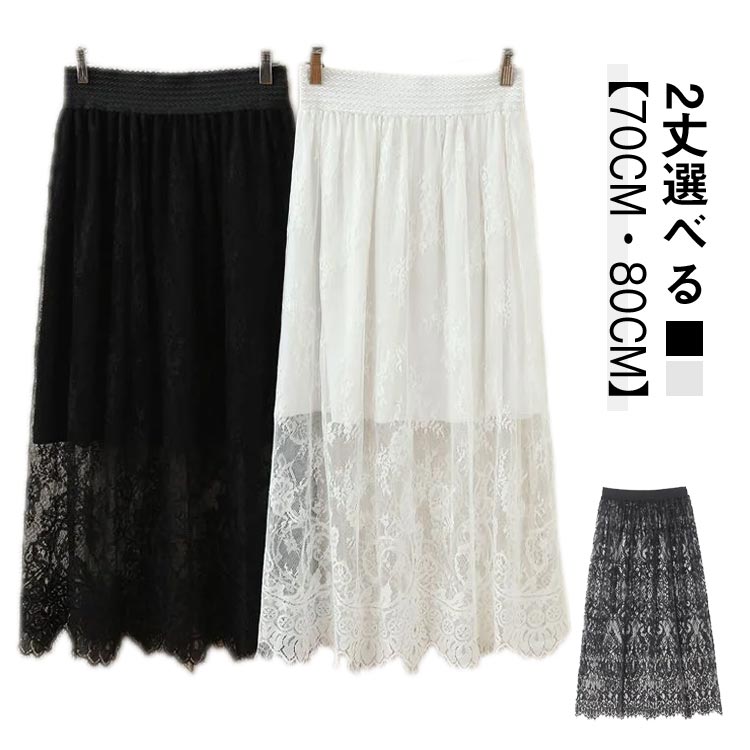 レーススカート ロングスカート マキシ丈 黒 白 インナー 体型カバー 丈増し ゴムウエスト ドレスインナー おしゃれ レイヤード