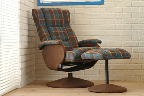- 軽快なデザインのチェアに、インテリアに調和しやすい ブラウンチェック柄の張地を合わせました パーソナルチェア リクライニングチェア チェア