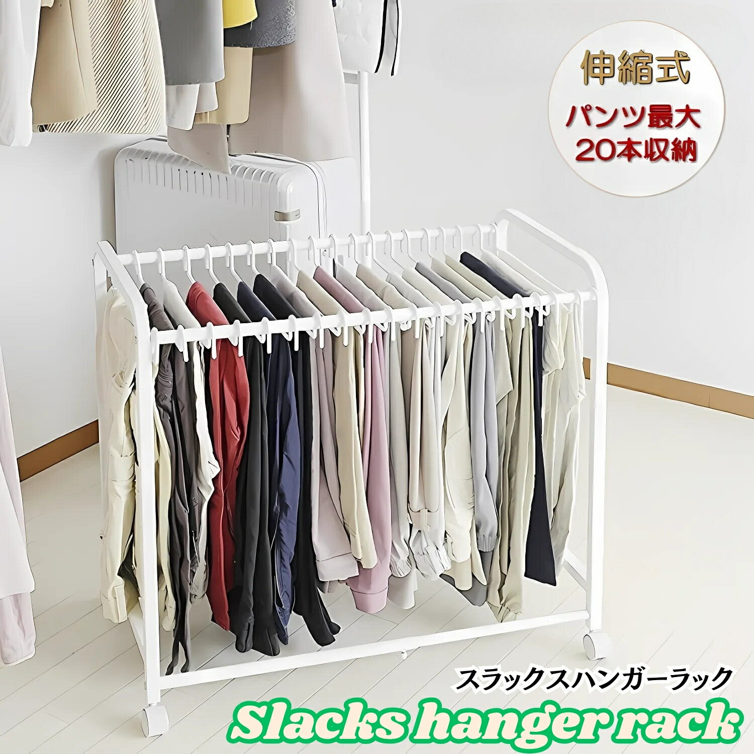 ハンガーラック 伸縮式 ワゴンタイプ パンツ20本収納 キャスター付き 丈夫 省スペース 北欧 組立簡単 スチール製 専用ハンガー付属 さびにくい ホワイト