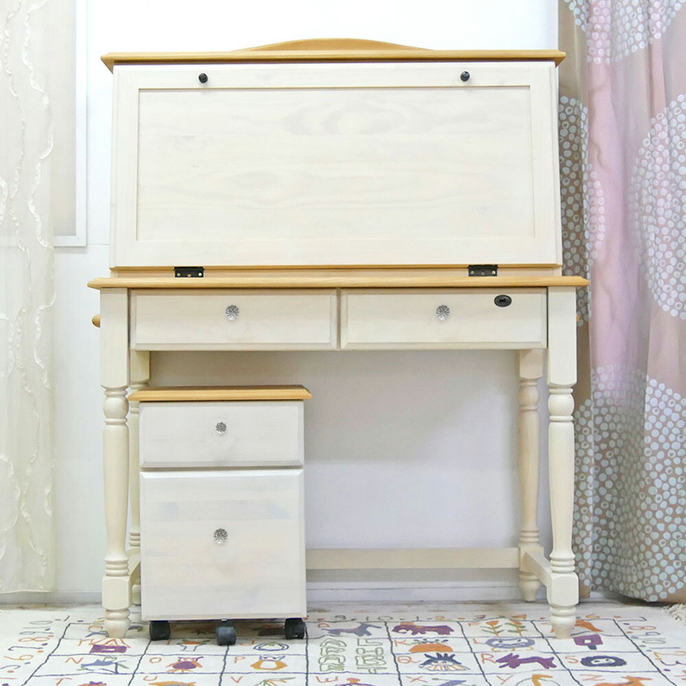 【カントリーライティングデスク/ワゴンチェストセット/クリスタル取っ手/ミルキーホワイト塗装】カントリーパイン学習机/フレンチカントリーライティングデス..