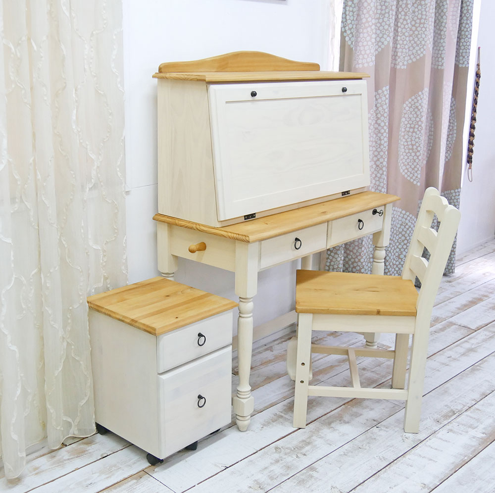 【カントリーライティングデスク/ワゴンチェスト+チェアセット/パイン木製取っ手/ミルキーホワイト塗装】カントリーパイン学習机/フレンチカントリーライティ..