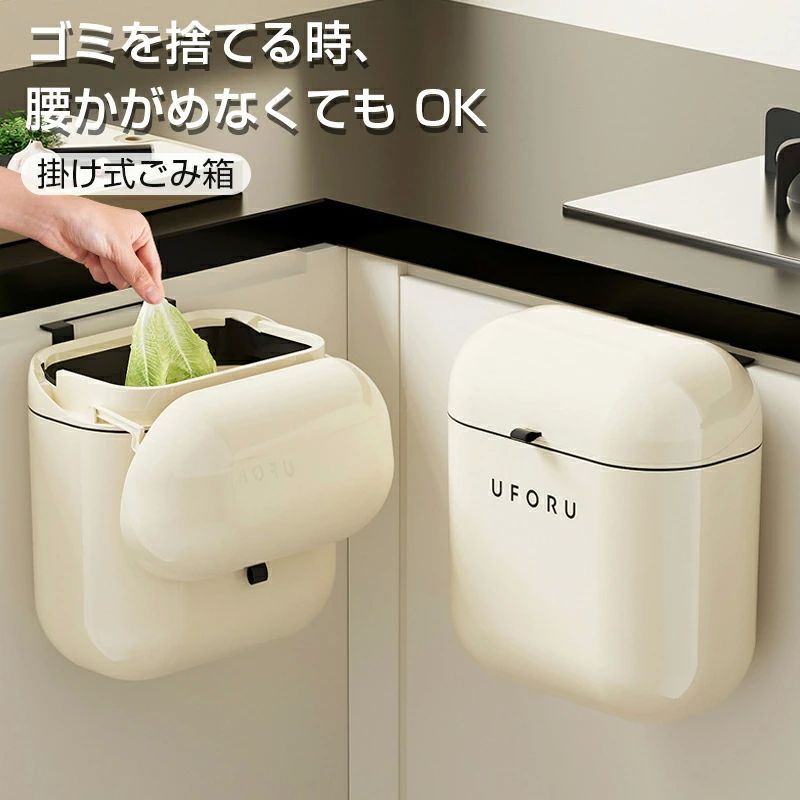 - キッチンは腰かがめない、バスは蓋で安心。壁掛けゴミ箱、2 つの