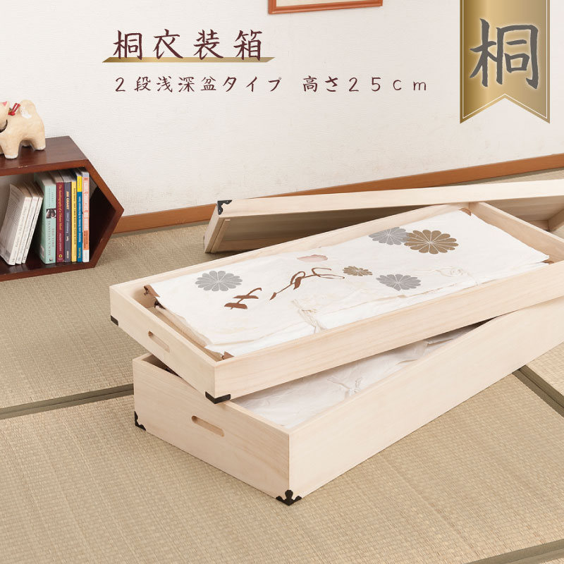 - 桐たんす 桐衣装箱 2段 高さ25cm 隅金具付 桐ケース 衣装ケース 押入れ クローゼット 保管庫 保管ケース 着物 衣類収納 洋服 浴衣