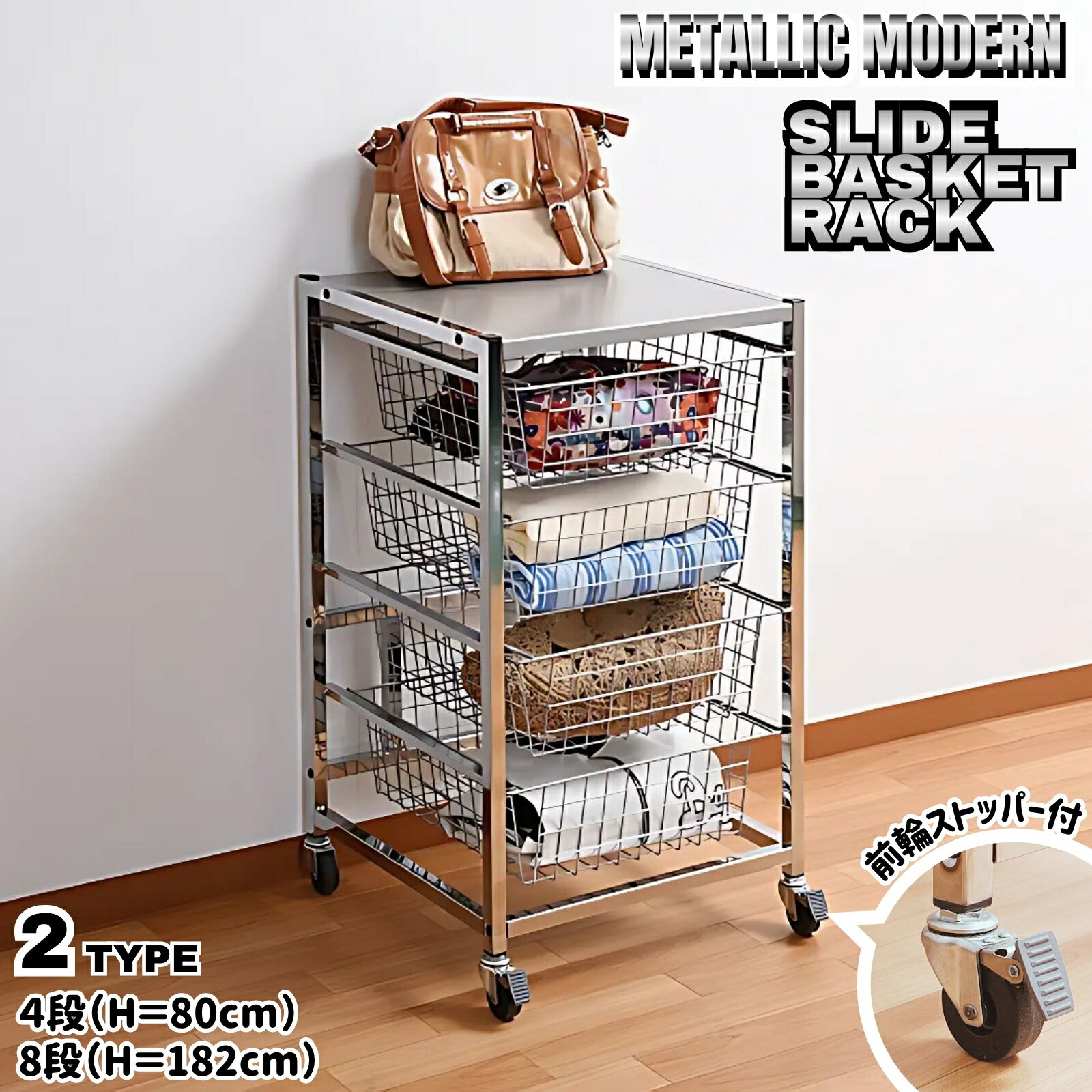 バスケットラック 4段/8段 スライド バスケット収納 スチールラック 光沢 スライドバスケット 収納 キッチン クローゼット 収納ラック キャスター付き 丈夫