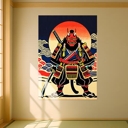 鬼 武士 鎧 日本刀 月 タペストリー 和モダン 和柄 浮世絵風 刺青風 昭和レトロ 壁掛け 大判 長方形 タトゥー ジャパニーズ 男気 アウトロー 壁布 赤 黒 黄色