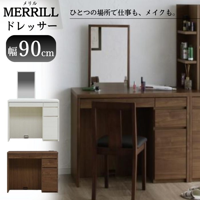 ドレッサー デスク 鏡台 メイク台 机 パソコンデスク ユニットタイプ メリル 収納型ドレッサー 幅90cm 90ドレッサー コンセント 鏡 ミラー 引き出し 収納 PCデ..
