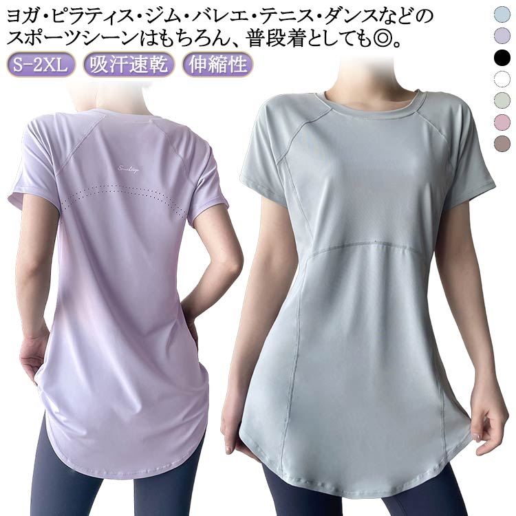 - ロング丈ヨガウエア 薄手 ストレッチ 速乾 体型カバー 半袖 ヨガウェア トップス ロング丈 ヨガtシャツ レディース 吸汗速乾 送料無料