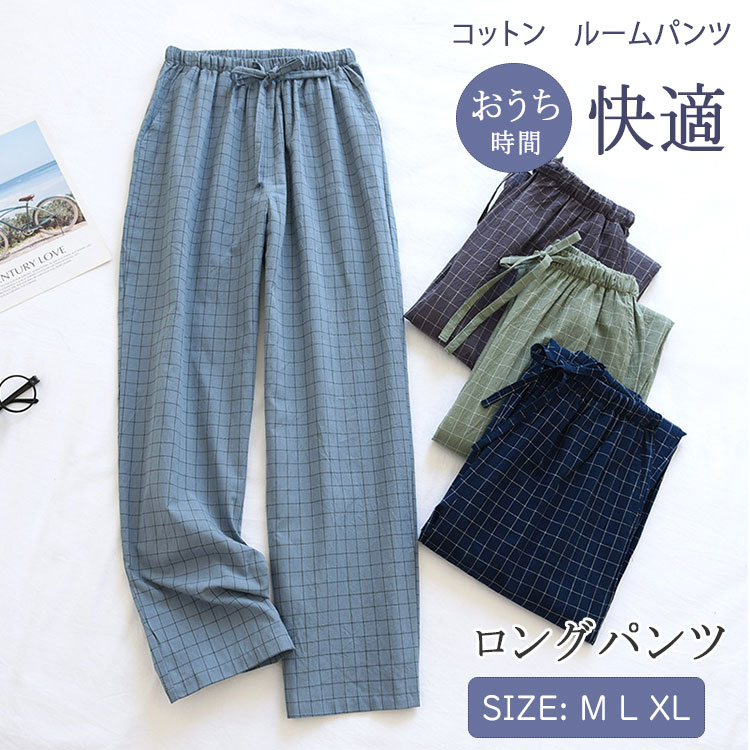 ルームウエア パンツ レディース メンズ 単品 綿 パジャマズボン ルームパンツ チェック柄 無地 ロング丈 ポケット付き 春 夏