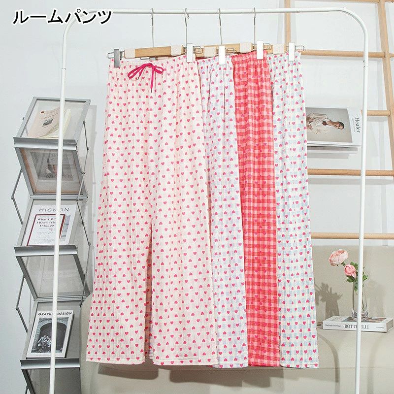 パンツ レディース ハート柄 ルームパンツ 薄手 長ズボン ルームウェア ウェストゴム かわいいパンツ 夏 通気性抜群 ボトムス ゆ