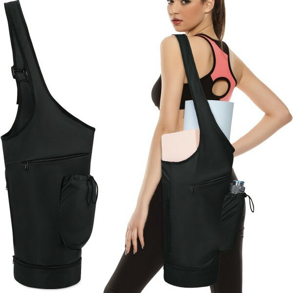 - ヨガマットバッグ、大開口式ロングトート・高品質ウェットポケット&ドローストリング水筒ポケット付き、調節可能なショルダーストラップ収納バッグ