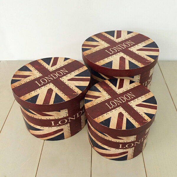 帽子入れ風 丸型ボックス 3点セット 小物入れ 収納箱 店舗ディスプレイ ユニオンジャック 木製 インテリア雑貨 おもちゃ箱 アンティーク インダストリアル 西..
