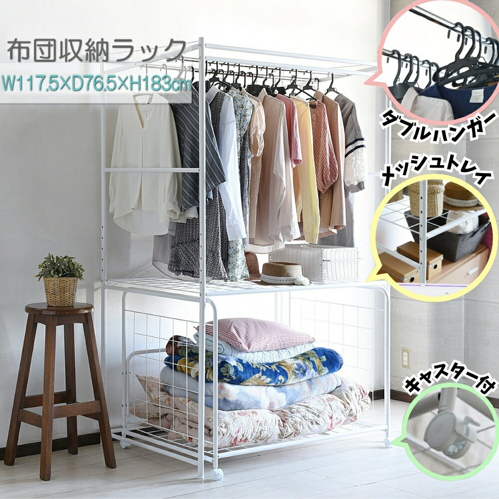 布団収納ラック スチールラック 壁面収納 キャスター付きワゴン 2段 出し入れ簡単 ダブルハンガー ハイタイプ ハンガーラック シンプル ホワイト 布団収納 衣..
