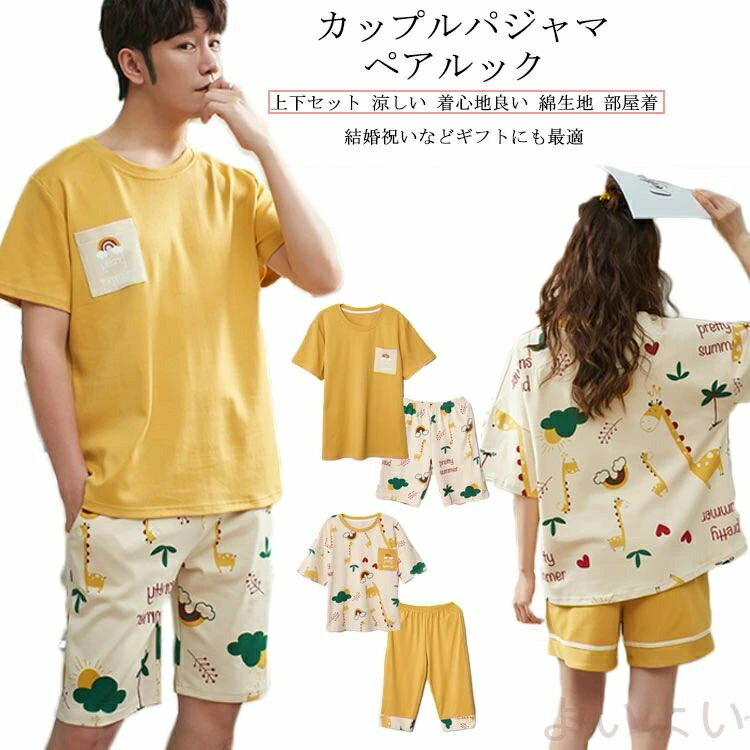 【送料無料】カップルパジャマ レディース メンズ ルームウェア 上下セット 2点セット ナイトウェア 涼しい 綿生地 セットアップ 部屋着 ゆったり 可愛い 半袖