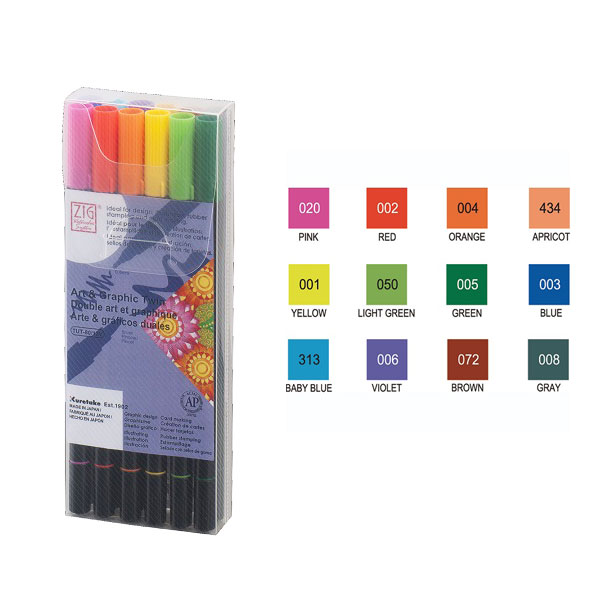 【お取寄せ】ZIG ART & GRAPHIC TWIN / BASIC・12V 12色セット 呉竹 カラーペン マーカー 水性染料インキ デザイン、イラスト スタンプ カードメイキング 文房..